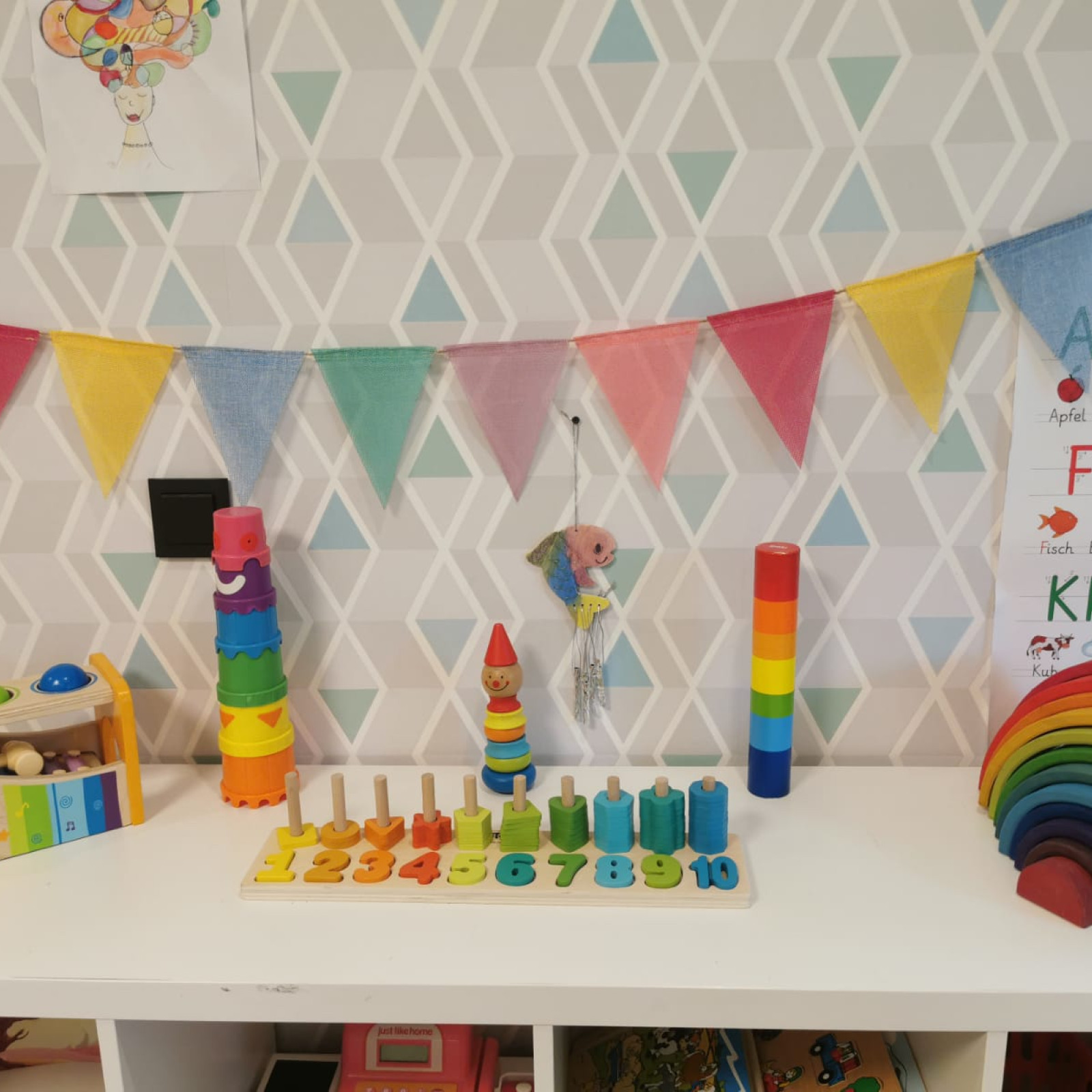 Kinder haben besondere Bedürfnisse an die Einrichtung: Für den Mittagsschlaf oder um sich auszuruhen gibt es den Schlafbereich mit einer eigenen Matratze für jedes Kind. Die Küche ist besonders wichtig: hier bereiten ich – auch oft gemeinsam mit den Kindern – die Mahlzeiten zu und lassen es uns zusammen am großen Tisch schmecken. Gerne auch mit meinen eigenen Kindern dabei am Familientisch. In den Räumen gibt es verschiedene Bereiche zum Basteln oder Spielen – mache Bereiche werden auch für verschiedene Anlässe umgeräumt. In den Räumen wird natürlich nicht geraucht.
